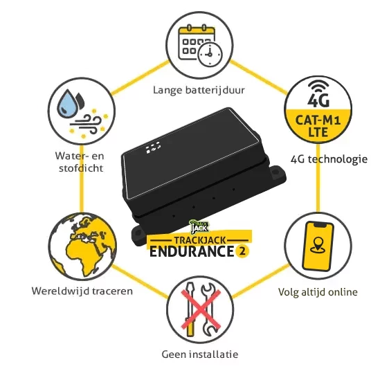 Idéal, le TrackJack Endurance est étanche à l'eau et à la poussière (IP66). Vous n'avez donc pas à vous soucier de la pluie si vous installez l'Endurance à l'extérieur ou dans un endroit un peu moins propre. L'Endurance est justement parfaitement adapté à cela.